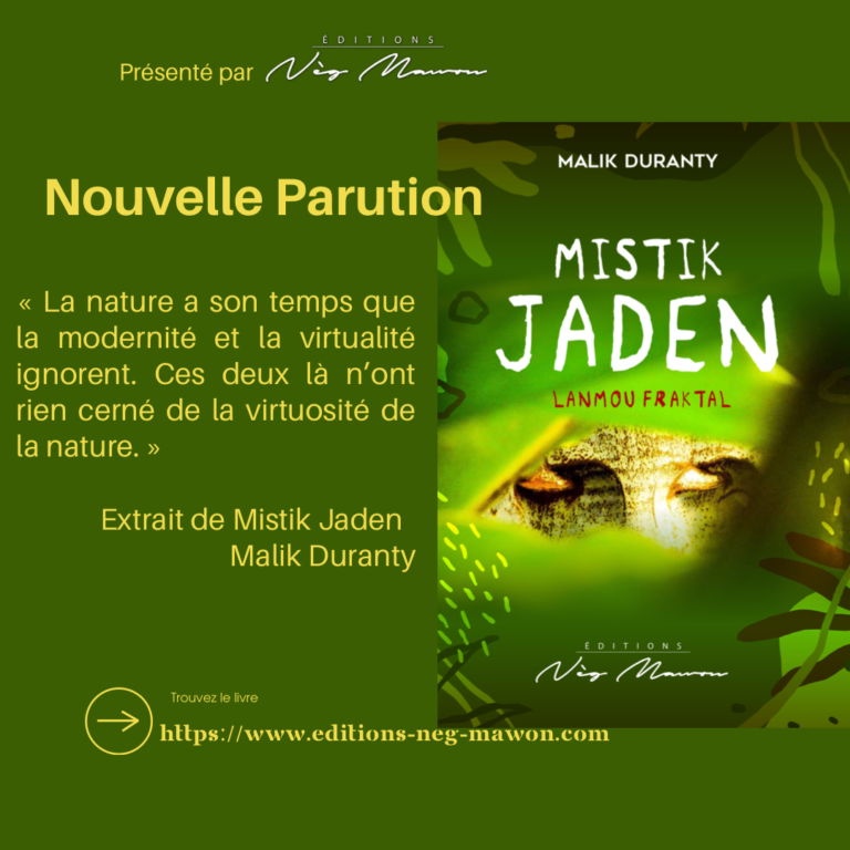 Parution du Roman-Conté de Malik Duranty aux Éditions Nèg Mawon. Un conte qui nous emmène au péyinouvo, le péyi des Nèg Zabitan.