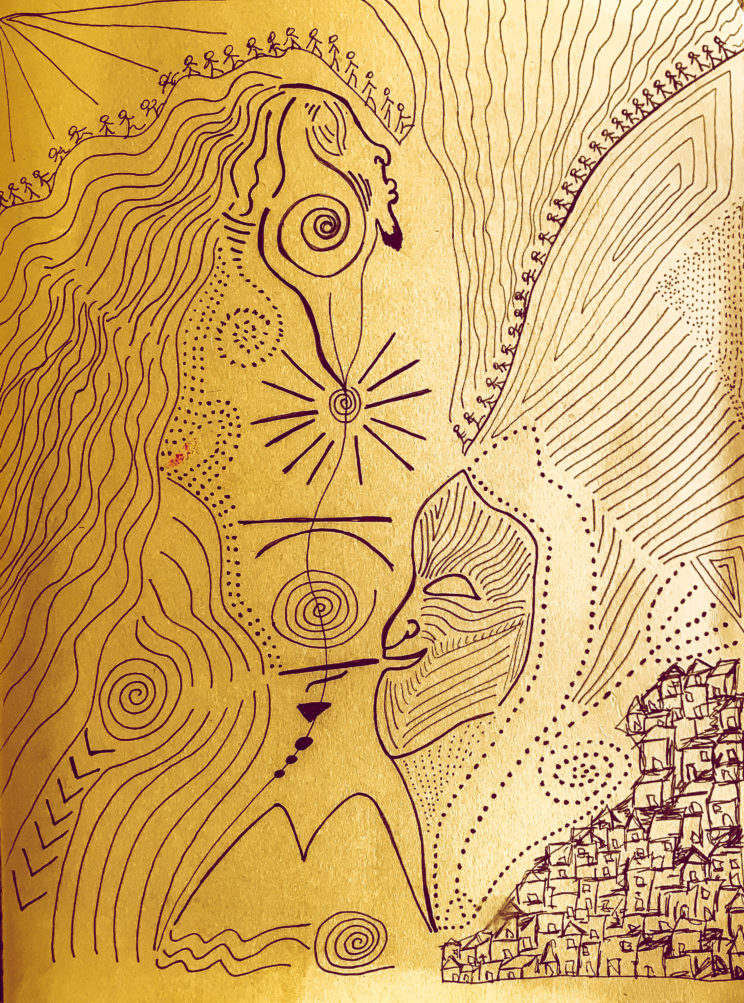 Dans ce songe, il me demande de me mettre debout et marcher vers l’horizon. Je me mets en marche vers l’horizon. Il va à côté de moi au même rythme cardiaque, il respire profondément, et j’entends sa voix psalmodier :