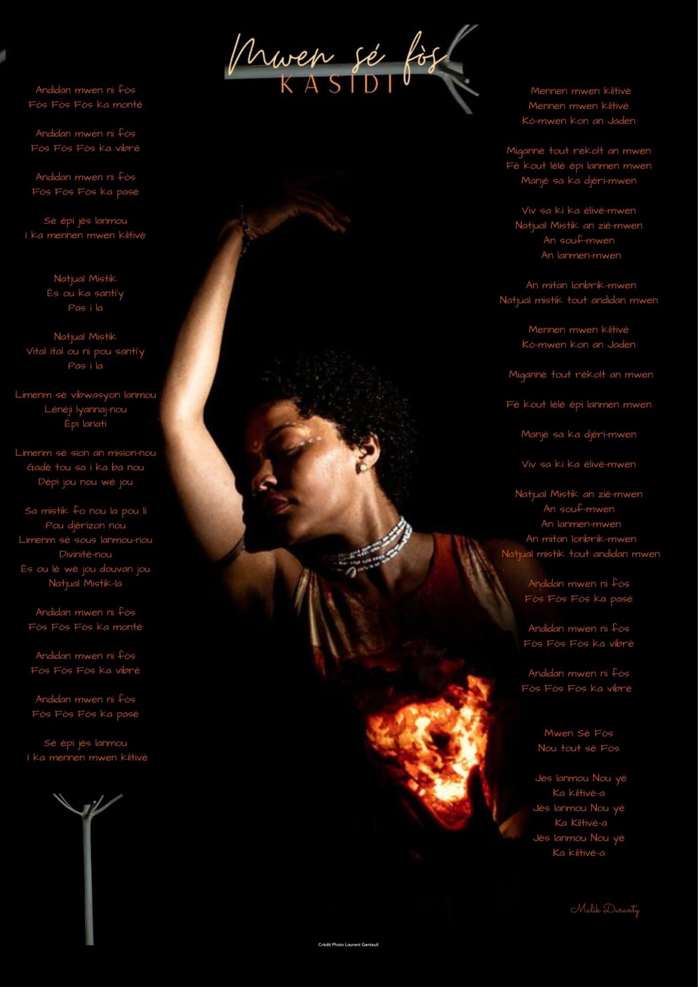 Malik Duranty par l’écriture,David Obadja par la composition musicale et Kasidi par son interprétation, une trinité qui engendre une musique ascensionnelle, une monté an mòn lavi-a. Le tout en une ode à la nature et à notre lien mystique avec elle. Lien qui n’a rien à voir avec une superstitieuse magie, mais bel et bien avec un geste d’amour que nous sommes et  qui est somme de nous pour la Création, en nous accordant par une culture de l’harmonie…