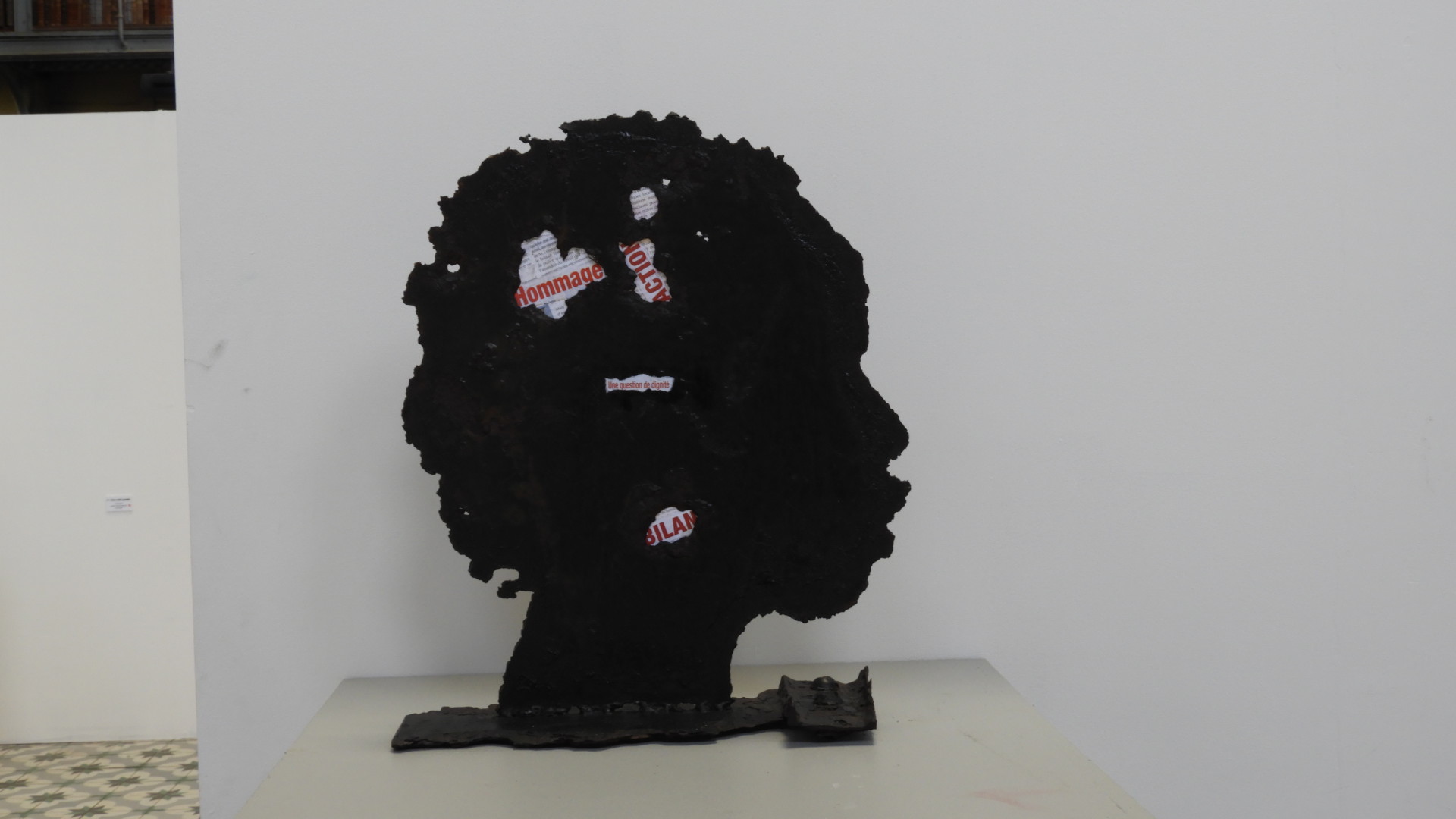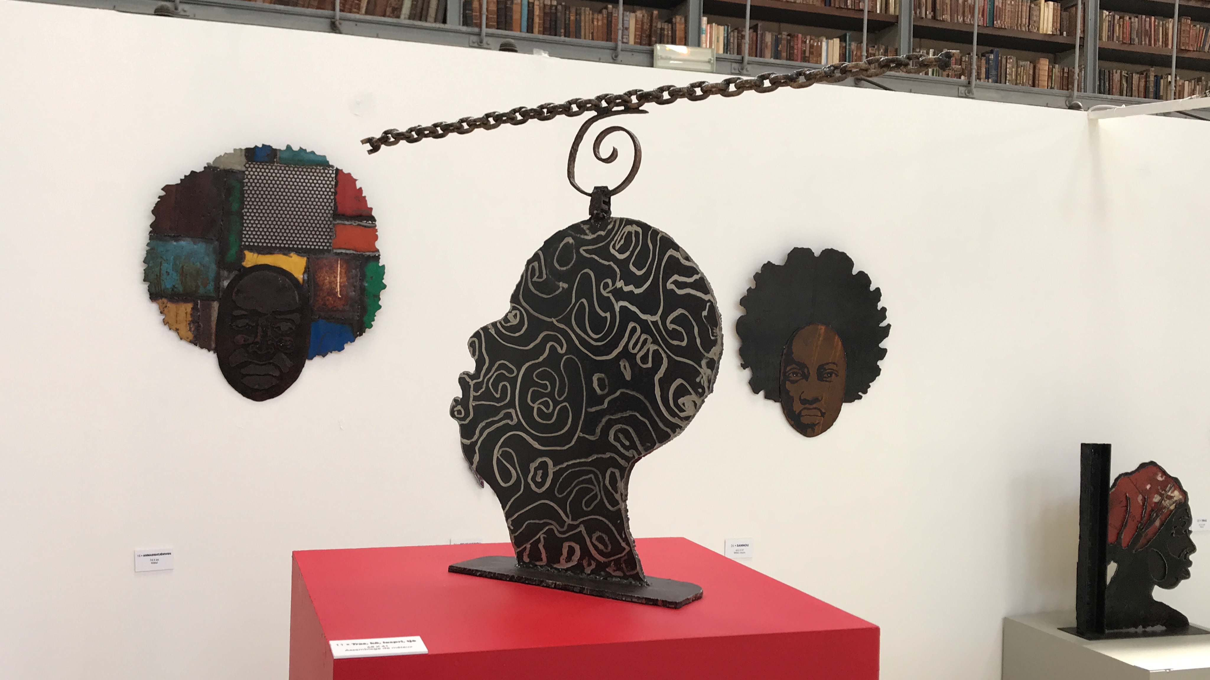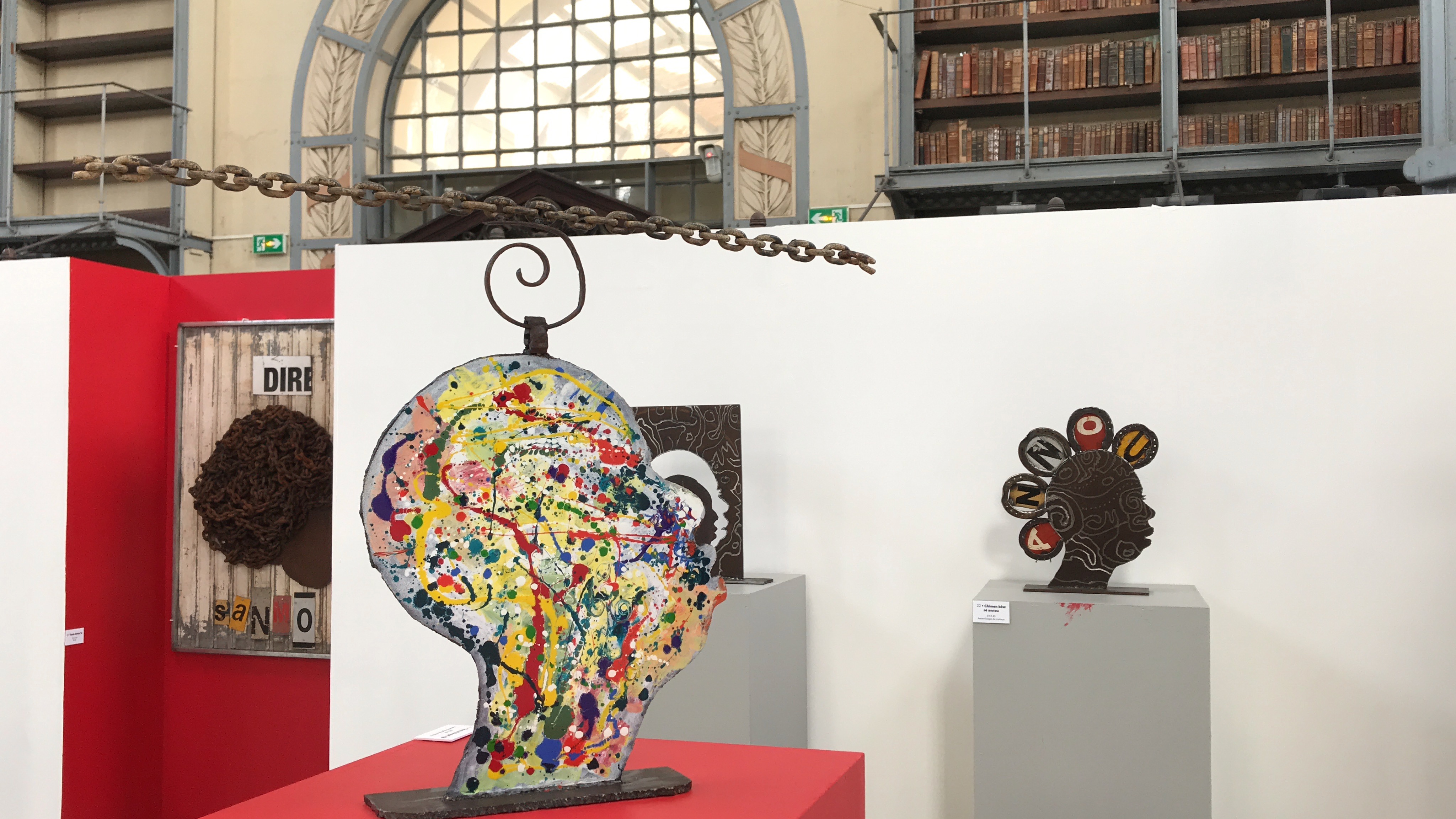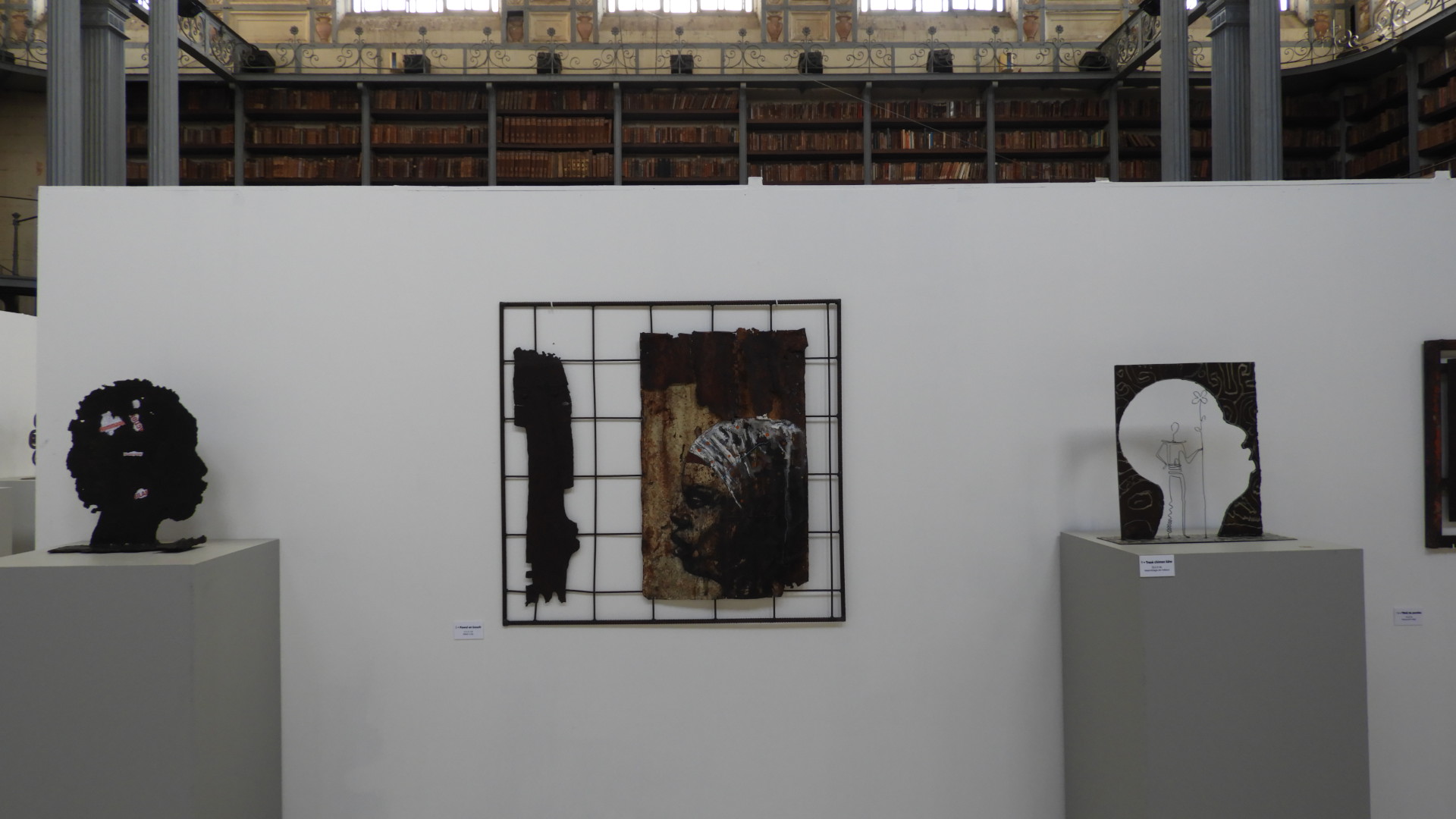 Ainsi, le hall de la Bibliothèque eut donc à se transformer le temps de cette exposition. Cette dernière qui reçut un bon accueil de la part du personnel de la Bibliothèque (les vivants de ce lieu). Ainsi, il fallut trois hommes et une femme pour, en trois jours, édifier l’installation de l’exposition.