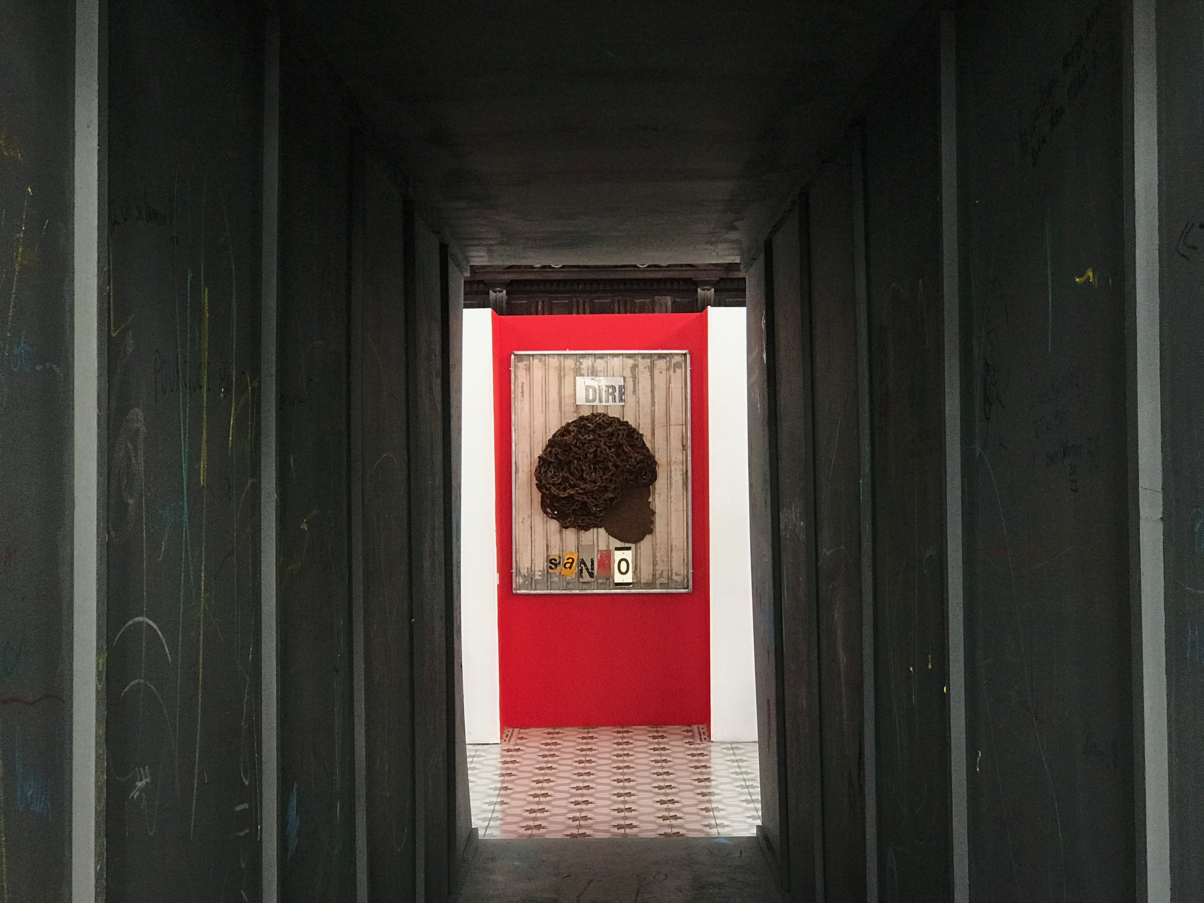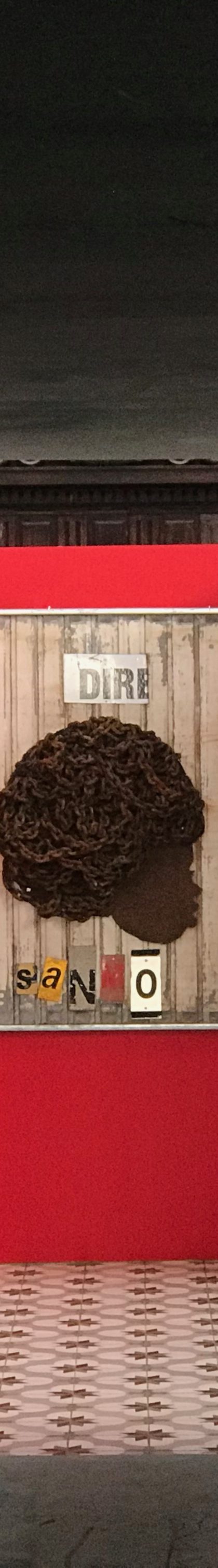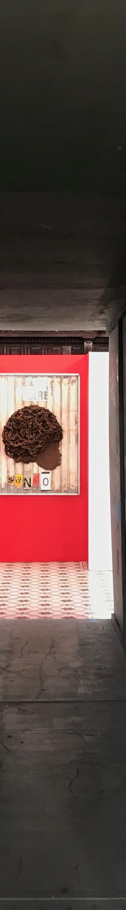 En effet, s’y dévoilait au bout d’un « boyo » sombre, une oeuvre monumentale accrochée dans une enclave rouge, dans le mur blanc de la paroi de la « matrice ». « Dire sanmo ». Qu’entends-tu ? Es-tu à l’écoute ?